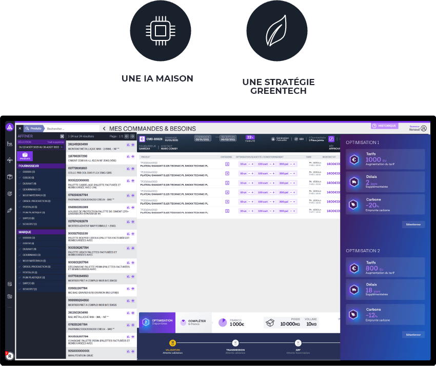 Basée sur des algorithmes avancés de Machine Learning et de Deep Learning pour anticiper la demande et optimiser les flux. Notre solution répond simultanément aux enjeux économiques et environnementaux, en optimisant les processus d’achats et d’approvisionnements.