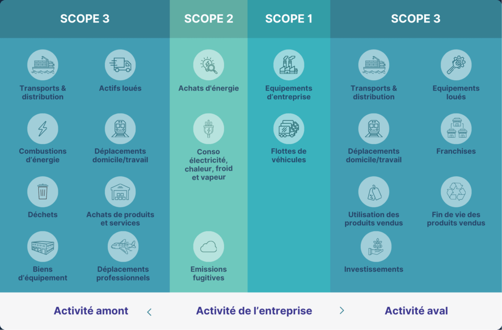 Pour lutter contre le changement climatique à l’échelle de l’entreprise, le point de départ impératif est de mesurer ses émissions carbone. Pour mesurer ces émissions, ces dernières ont été catégorisées selon 3 périmètres ou “scopes”.