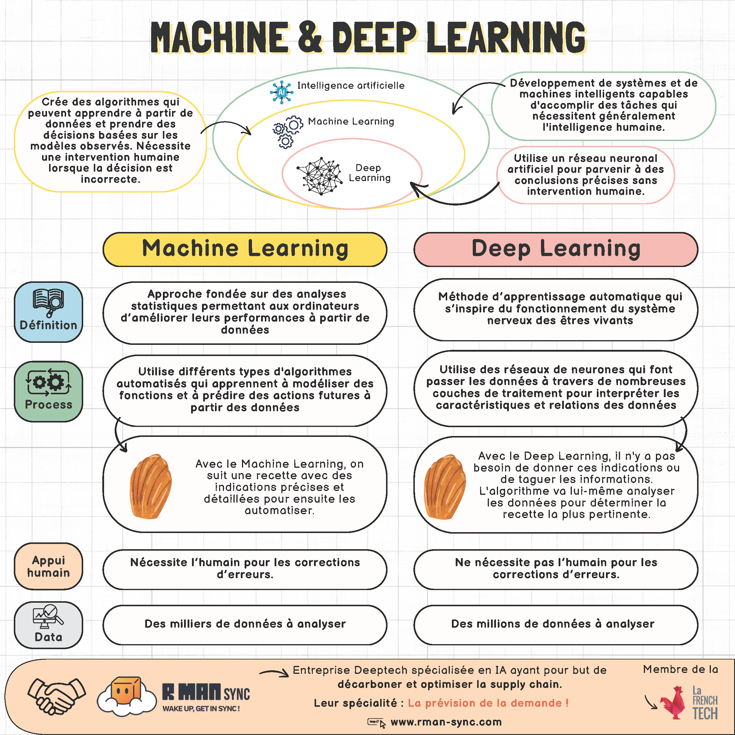 • Deep Learning : Basé sur des réseaux neuronaux, le Deep Learning permet d’analyser des ensembles massifs de données hétérogènes et complexes. Contrairement au Machine Learning, il apprend et s’adapte de façon autonome, sans intervention humaine directe.