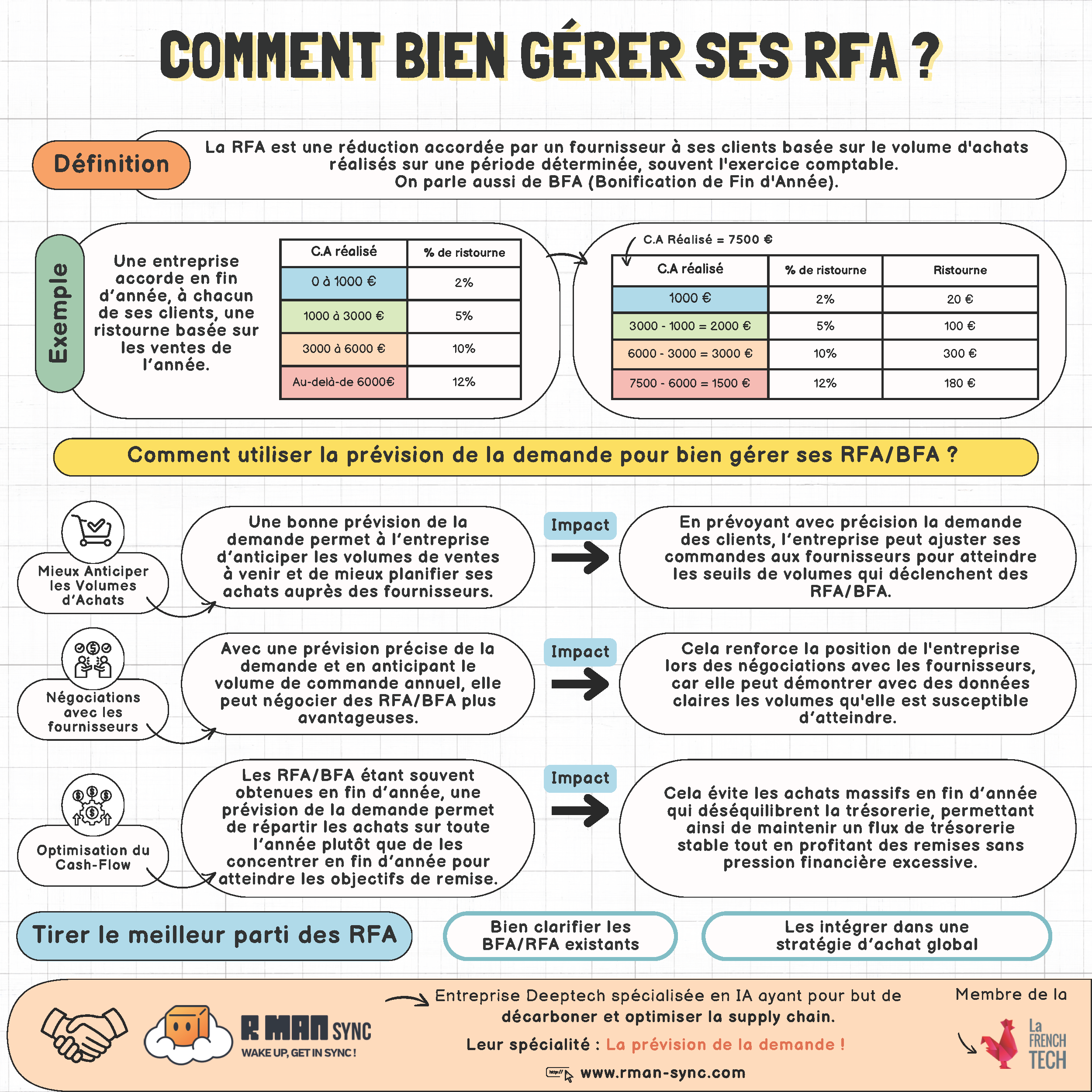 Les Remises de Fin d’Année (RFA), également appelées Bonifications de Fin d’Année (BFA), sont des remises accordées par les fournisseurs aux entreprises en fonction du volume d’achats réalisés sur une période donnée (souvent une année). Ces remises sont progressives : plus les volumes atteignent des seuils définis, plus le pourcentage de remise est élevé. Grâce à une prévision de la demande fiable, les entreprises vont pouvoir optimiser cette gestion des RFA.
