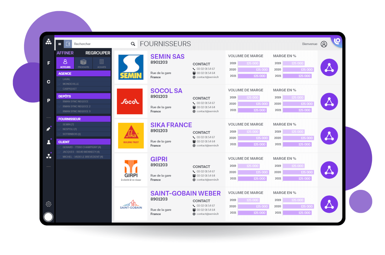 Notre moteur de recherche agrège les données pour afficher des résultats regroupés par catégories ou par cumul. Cela permet la manipulation des données facilement, mais aussi de pouvoir afficher des statistiques en temps réel, comme par exemple avec la recherche d’un chiffre d’affaires. Cette agrégation des données contribue également à réunir des informations clés et ainsi renforcer la synergie entre les services achat, approvisionnement et commercial.